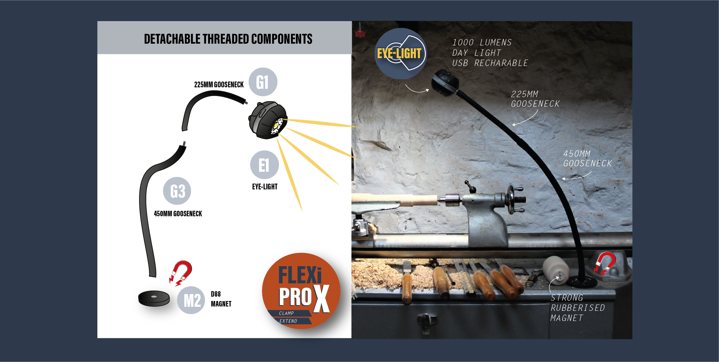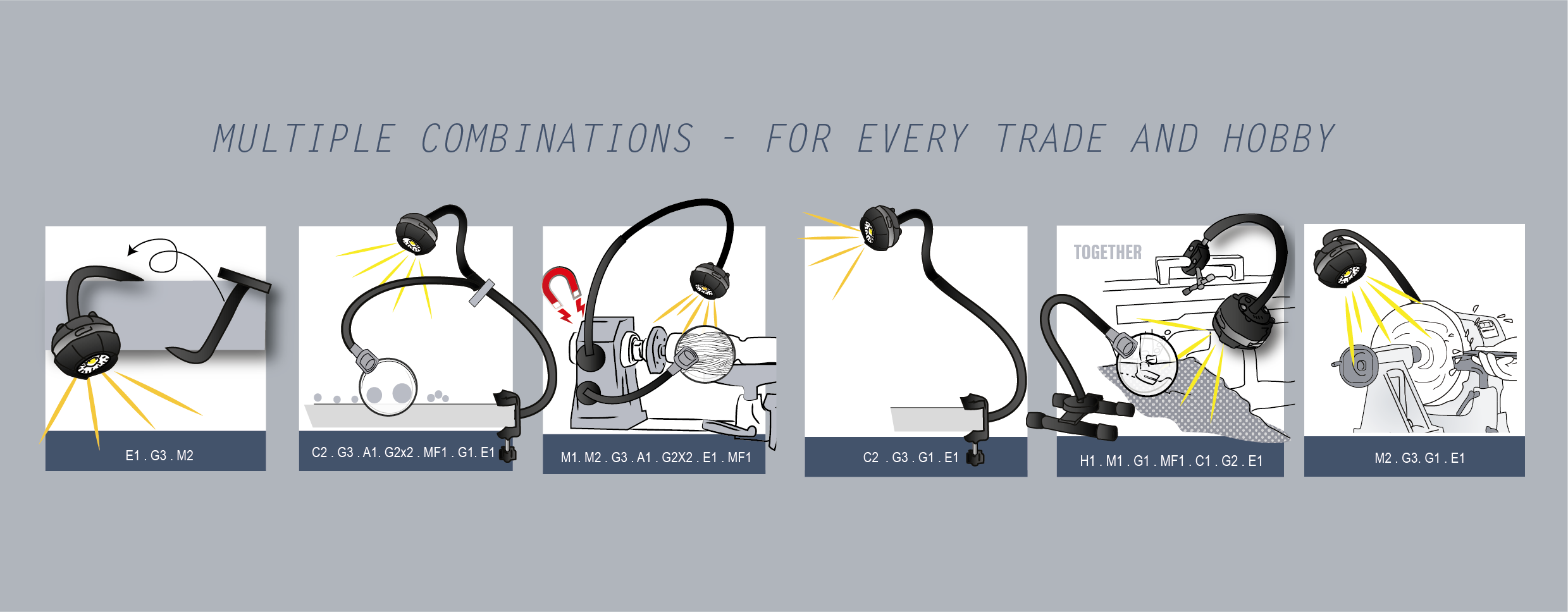 Whether you're into quilting, fine-tuning a model, engrossed in woodworking, or just enjoying a good book, the GloForce EYE-LIGHT is your partner. Our suite of modular accessories, including diverse clamps and additional goosenecks, allows you to customise your lighting setup, fitting any and every setting you can envision.
