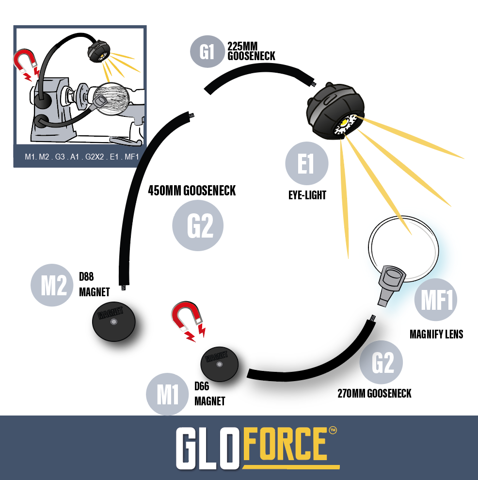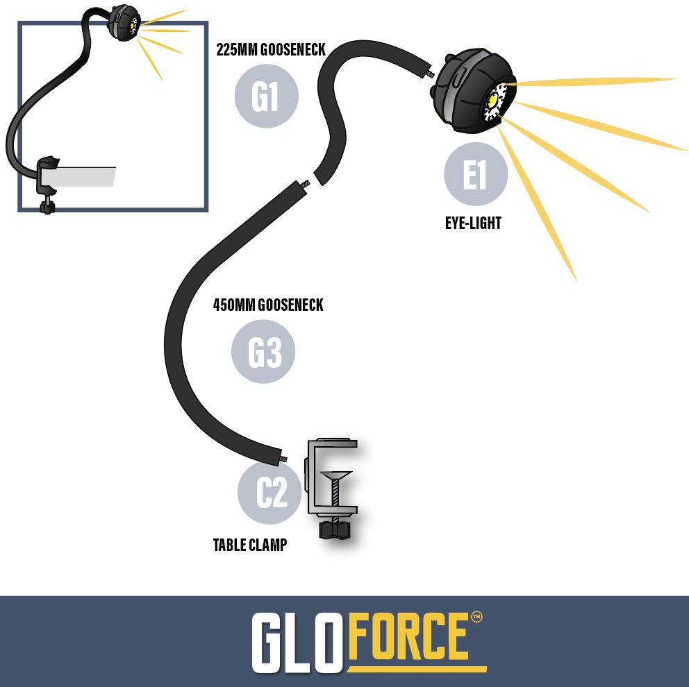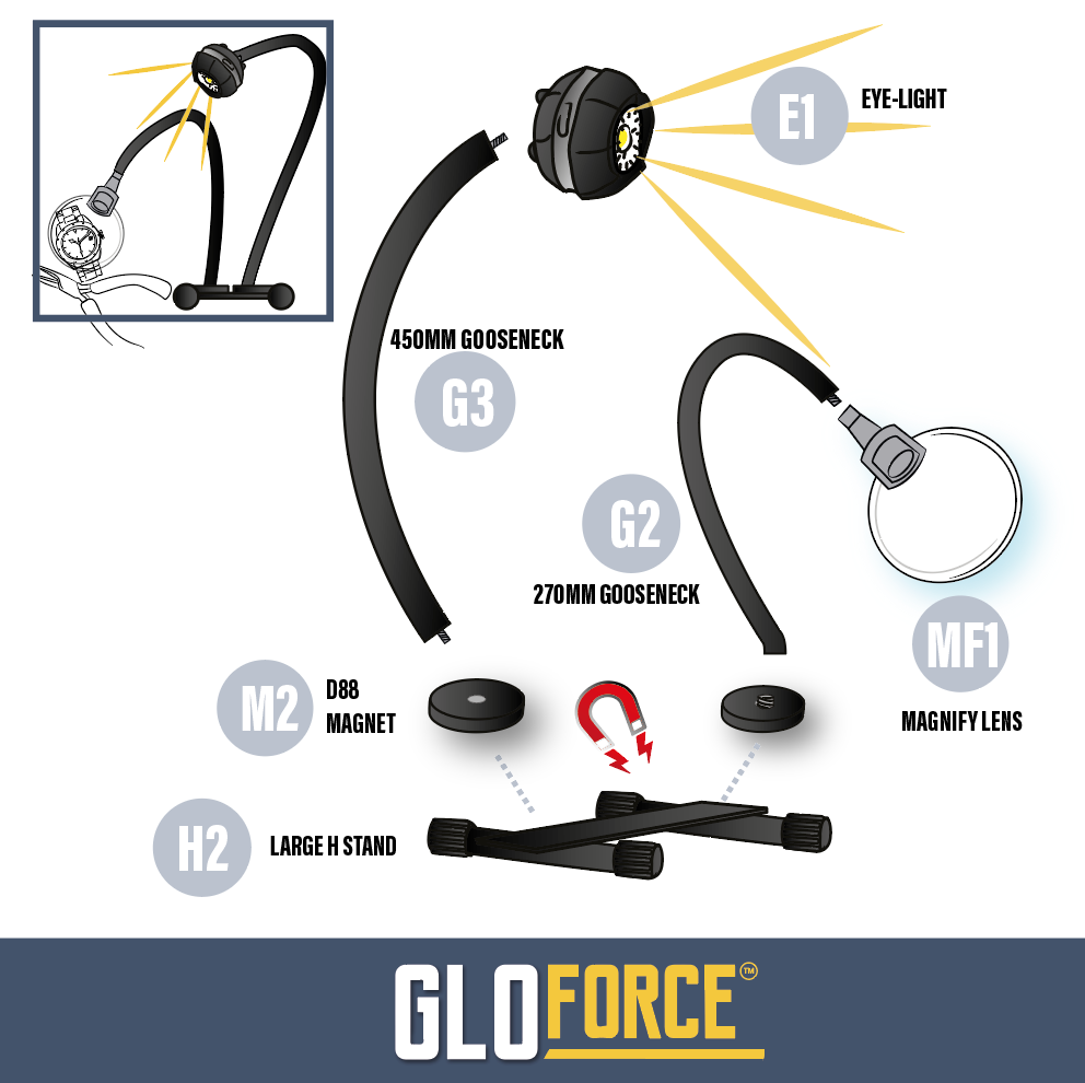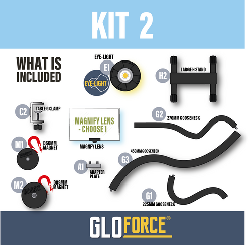 The Combo Kit 2 - Takes flexibility and reach to the next level. It allows you to independently adjust the EYE-LIGHT and magnifier to suit your tasks, just like kit 1, but with even more reach and versatility. Ideal for hands-on work where precision and extensive coverage are key, it’s a simple yet powerful solution for seeing every detail just right – and with even more options to fit your specific needs.