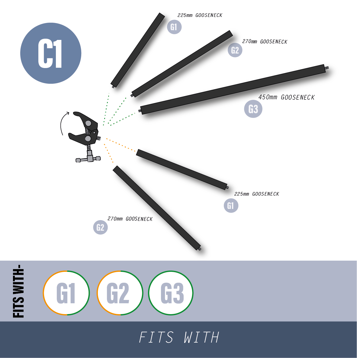 Primary Function: Expertly designed to clamp onto various surfaces, the C1 Dino Jaw Clamp’s jaws adjust up to 55mm. This makes it ideal for securing G1 or G2 goosenecks, allowing them to hold firmly in place on misshaped items or flat surfaces up to 55mm in depth.
