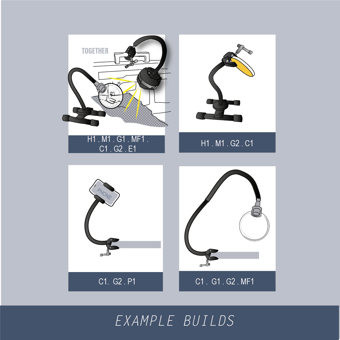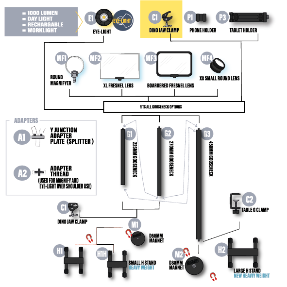 Secondary Utility: Featuring both male and female 1/4 inch threads, this clamp can also attach to the other end of any G1, G2, or G3 gooseneck. Instead of supporting a light or magnifier, it can function as a 'third hand', holding various items in place for hands-free convenience.