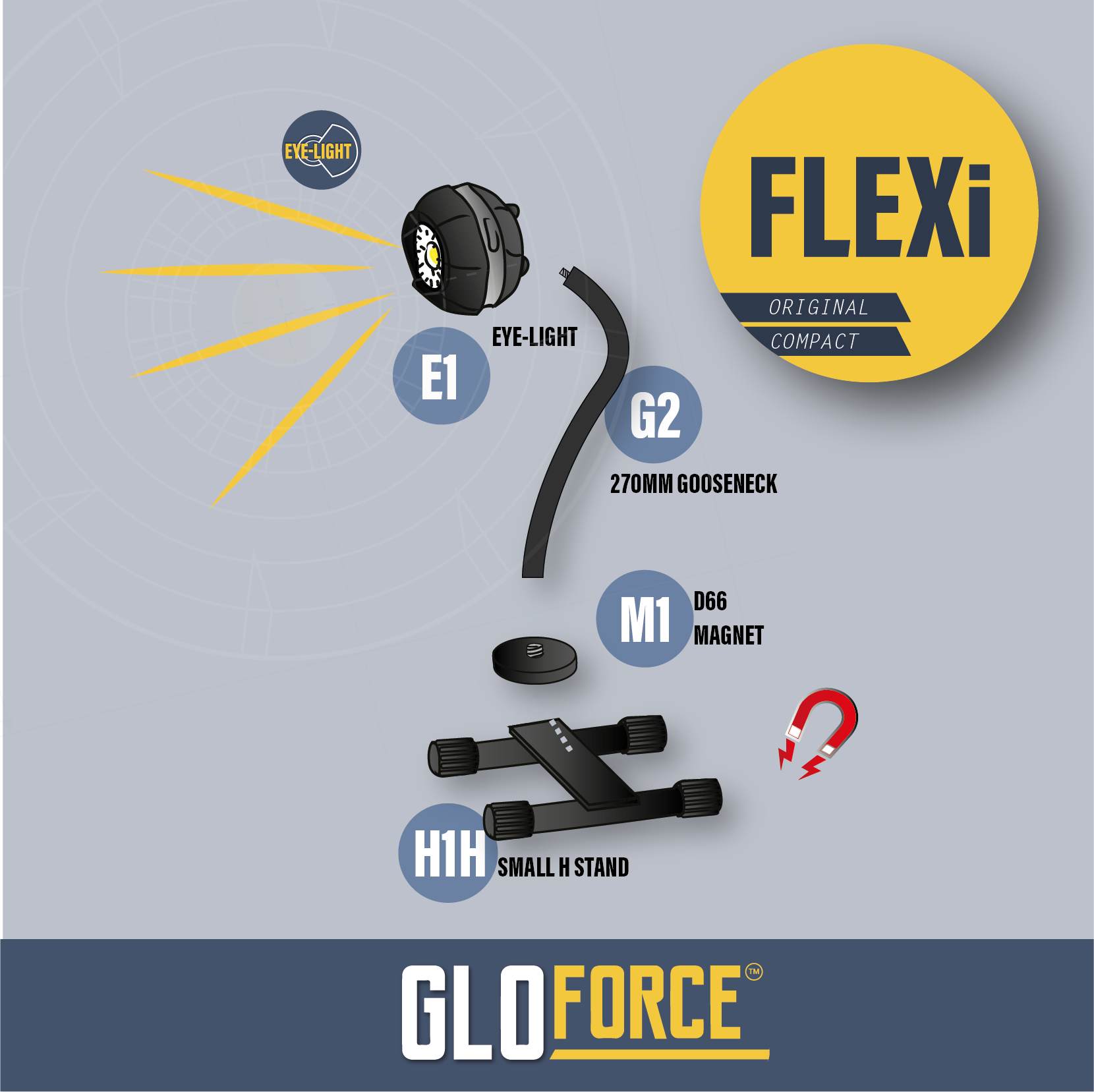 The foundational Flexi Kit from GloForce is designed for versatility. This kit features the EYE-LIGHT with its daylight-quality illumination, complemented by a flexible 270mm Gooseneck, a sturdy 66mm Rubberized Magnet, and a convenient H-Stand.