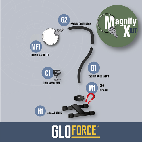 Product Description: Elevate your magnification experience with the MAGNIFY X Kit. This exceptional kit boasts two G2 270mm goosenecks, providing a total reach of 540mm. It also includes the C1 Dino clamp, adding more versatility to your magnification tasks.