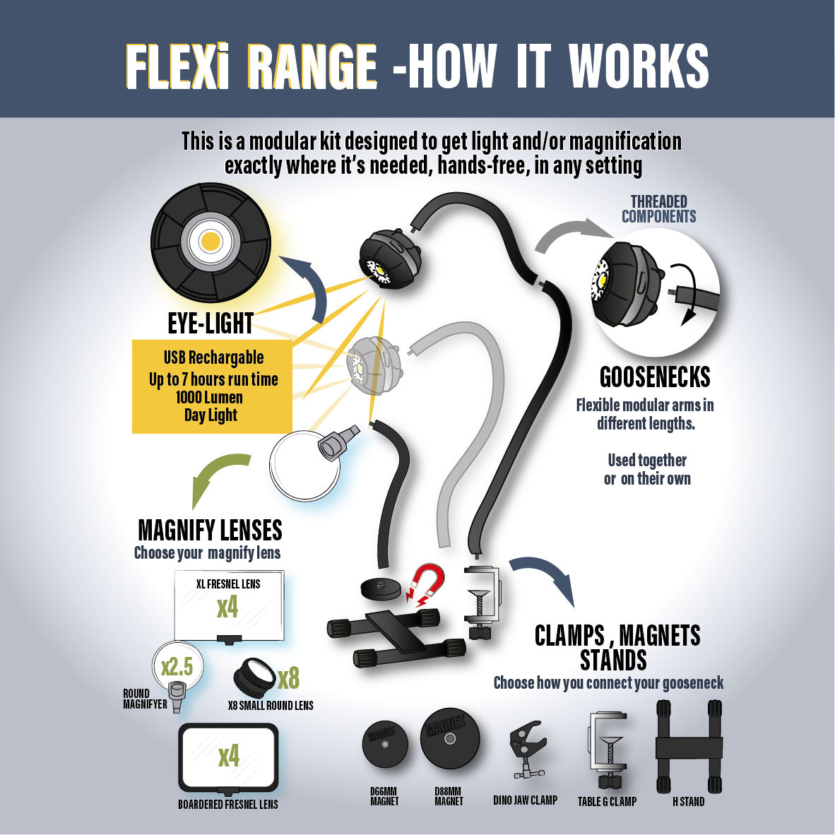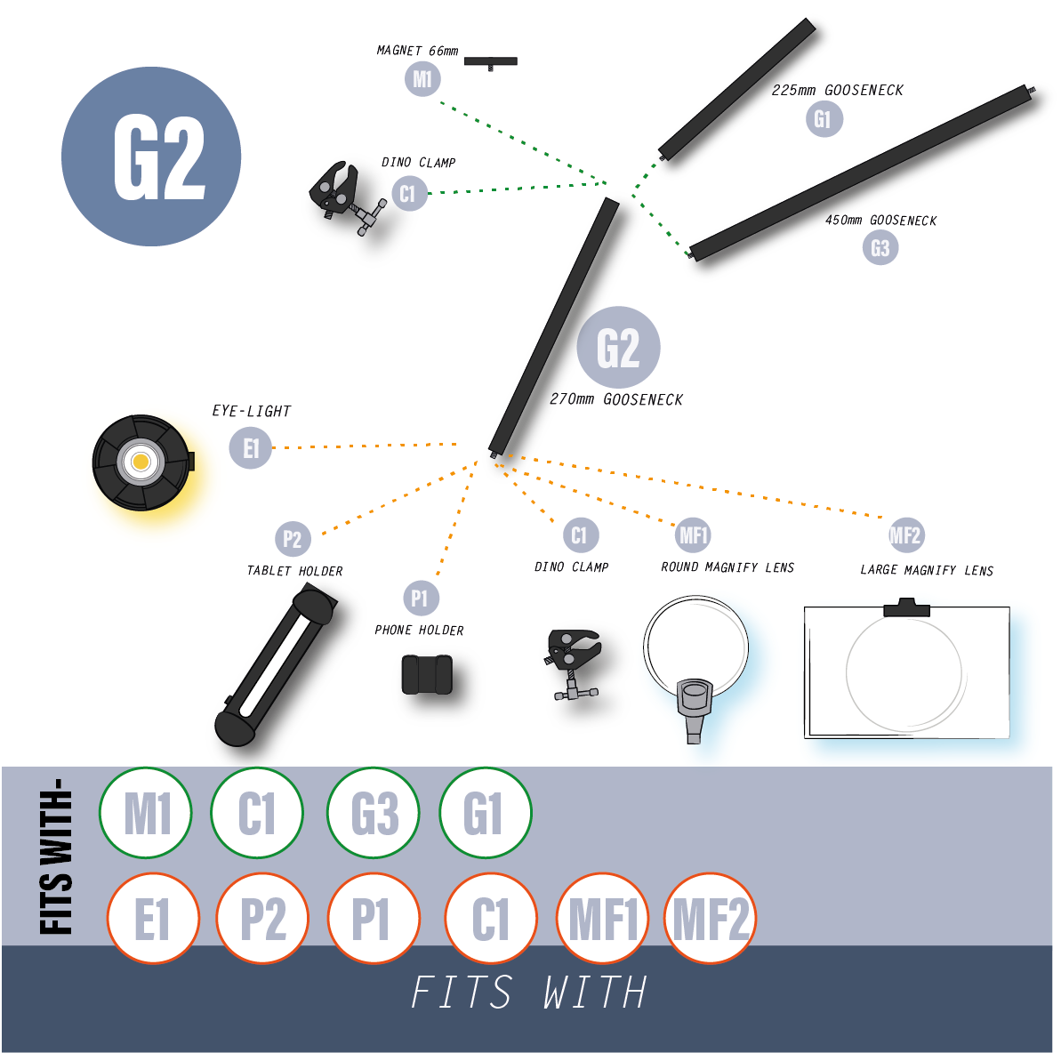 Extensive Component Range: This comprehensive kit includes the full spectrum of GloForce FLEXi products: all goosenecks (G1, G2, G3), clamps (including the C1 Dyno Jaw Clamp), magnets, the EYE-LIGHT, magnifiers, phone holder, tablet holder, and adapter parts like the A2 adapter thread.
